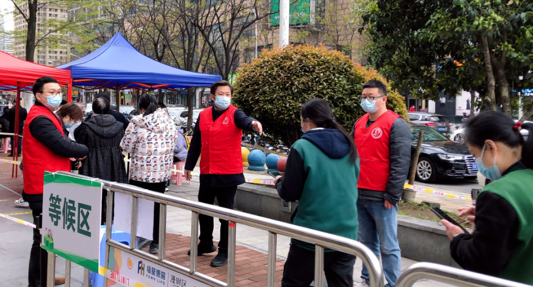为坚决阻断疫情传播渠道,科学精准有效防控疫情,切实保障人民群众生命安全和身体健康,武汉市自3月23日起迅速启动新一轮核酸检测。为支援社区核酸检测工作,永业行党委、青年委员会组织8名志愿者,在副总裁程为民带领下前往武昌区徐家棚街道水岸国际社区2个检测点开展志愿服务工作。志愿者们秉承着“奉献、友爱、互助、进步”的志愿者精神,冲锋在前,“疫”无反顾,为社区防疫增添一抺青春亮色。 志愿者们来到核酸检测点后,立即开展相关志愿服务,有的维持核酸检测队伍秩序,有的帮助老人和孩子注册健康码和行程码,有的引导检测人群入场,帮助居民尽快完成核酸检测。在他们的耐心引导下,检测现场秩序井然有序,检测效率